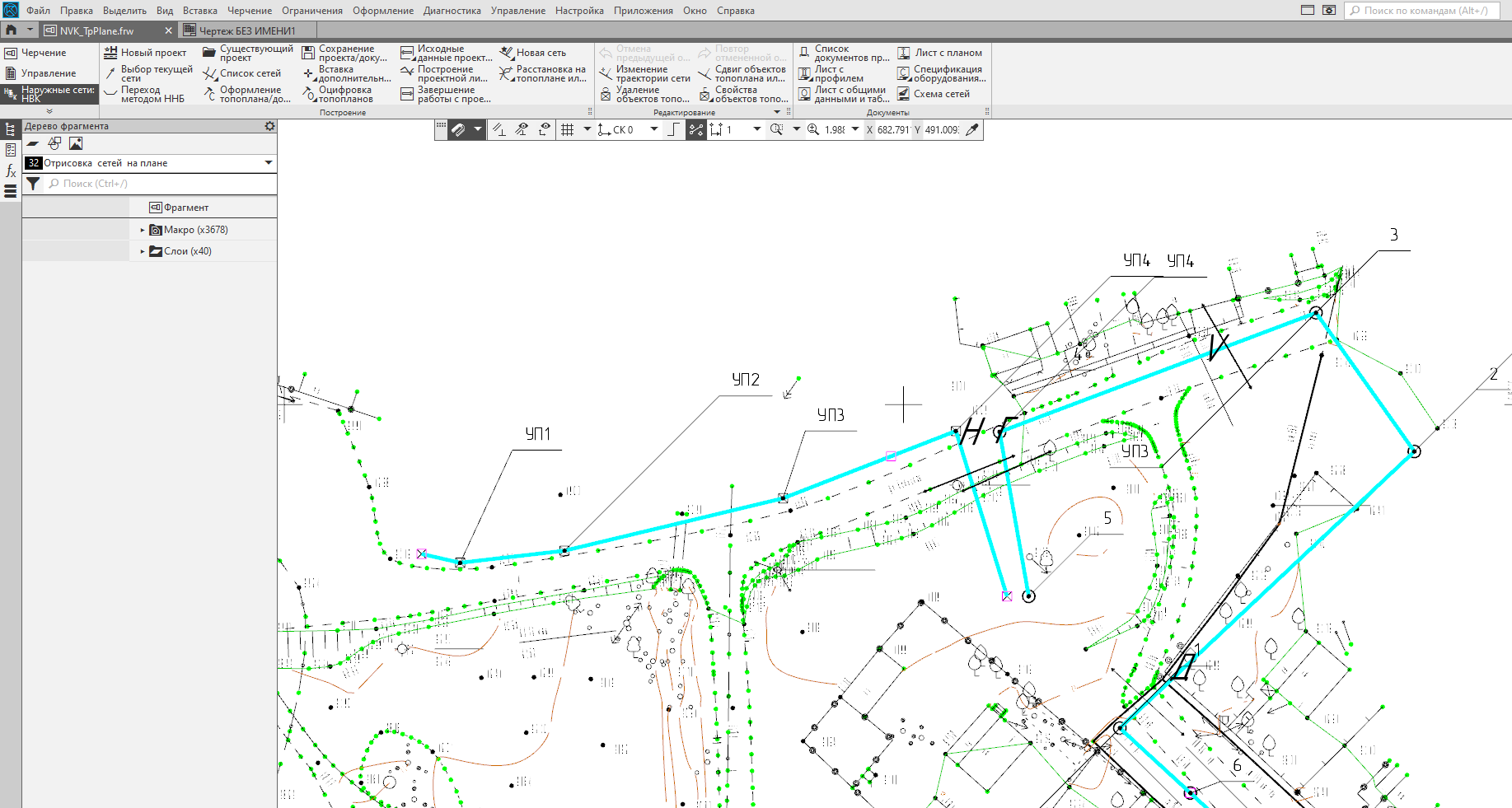 - При построении схем тепловых сетей информация переносится из плана автоматически, что обеспечивает согласованность данных и сокращает время на ручной ввод.
